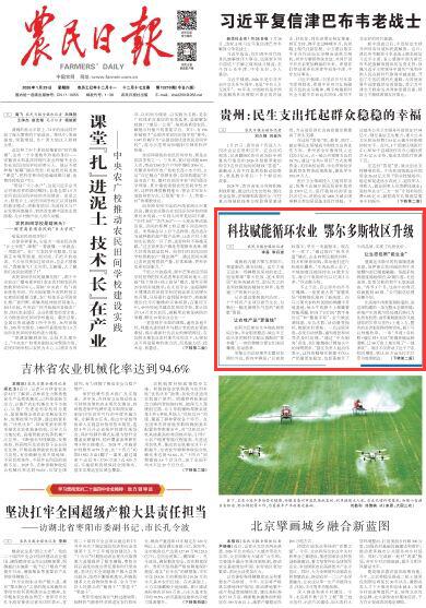 2026年1月29日,《農(nóng)民日?qǐng)?bào)》頭版刊發(fā)題為《科技賦能循環(huán)農(nóng)業(yè) 鄂爾多斯牧區(qū)升級(jí)》的文章,報(bào)道了在內(nèi)蒙古鄂爾多斯市祖祖輩輩“靠天吃飯、逐水草而居”的傳統(tǒng)被改寫,取而代之的是科技賦能的精細(xì)化種養(yǎng),是貫通三產(chǎn)的新興業(yè)態(tài)。越來(lái)越多的農(nóng)牧民,正沿著“新一產(chǎn)”鋪就的這條路,走向收入更穩(wěn)、底氣更足的好日子?! ?/p>