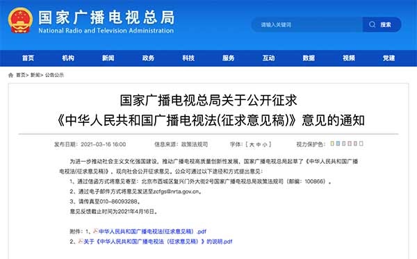 3月16日,國家廣播電視總局發(fā)布《中華人民共和國廣播電視法(征求意見稿)》(以下簡稱“征求意見稿”),向社會(huì)公開征求意見。征求意見稿分為總則、業(yè)務(wù)準(zhǔn)入、制作播放、傳輸覆蓋、公共服務(wù)、扶持促進(jìn)、安全保障、監(jiān)督管理、法律責(zé)任和附則,共10章80條。意見反饋截止日期為2021年4月16日。