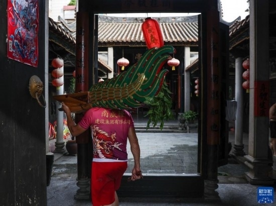 6月22日,佛山疊滘端午龍船漂移賽結(jié)束后,“扒仔”(槳手)將龍船的龍頭龍尾請(qǐng)回家族祠堂保管。