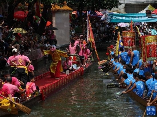 這是佛山疊滘端午龍船漂移賽開(kāi)始前的龍船巡游(6月22日攝)。