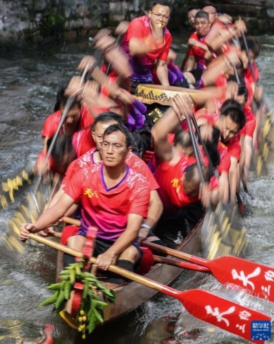 龍船漂移時(shí),船頭船尾的舵手專(zhuān)門(mén)負(fù)責(zé)入彎出彎時(shí)的線路和速度控制(6月22日攝)。