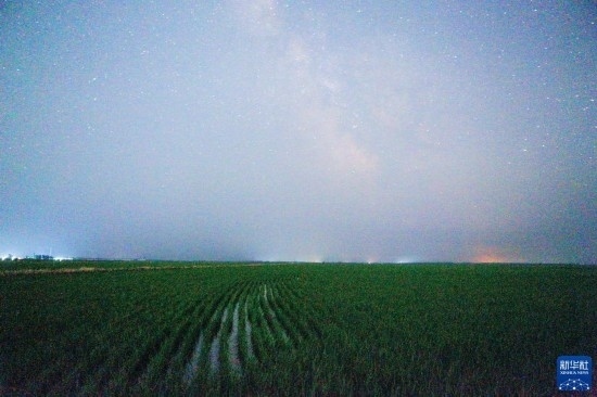 這是6月25日夜晚在黑龍江省富錦市萬畝水稻公園內(nèi)拍攝的稻田和星空(長時間曝光)。