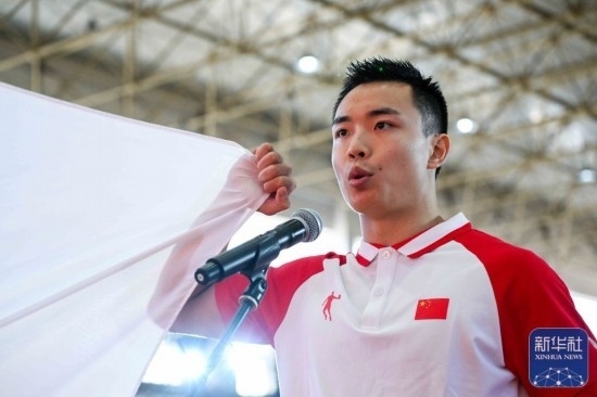 運(yùn)動(dòng)員代表曹茂園在成立大會(huì)上宣誓。 新華社記者 顏麟蘊(yùn) 攝