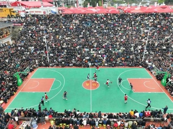 這是3月27日在貴州省黔東南州臺(tái)江縣臺(tái)盤村拍攝的貴州省首屆“美麗鄉(xiāng)村”籃球聯(lián)賽總決賽比賽現(xiàn)場(chǎng)(無人機(jī)照片)。新華社記者歐東衢攝