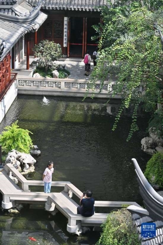 8月28日,參觀者在中國園林博物館鏡影亭參觀。