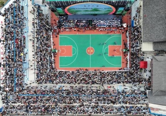這是10月25日拍攝的全國(guó)和美鄉(xiāng)村籃球大賽(村BA)總決賽現(xiàn)場(chǎng)(無(wú)人機(jī)照片)。新華社記者 歐東衢 攝