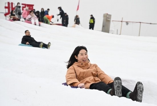 冬季的內(nèi)蒙古賽馬場(chǎng)變成了冰雪樂(lè)園,場(chǎng)地中間建起一座十幾米高的人造雪山,等著玩滑雪圈的人群從山頂一直排到山腳下,周?chē)€有冰上腳踏車(chē)、冰上陀螺等冰雪體驗(yàn)設(shè)備。曹博雅坐著雪圈從山頂飛速滑下,又拉著爸爸坐上了旋轉(zhuǎn)小雪車(chē)。