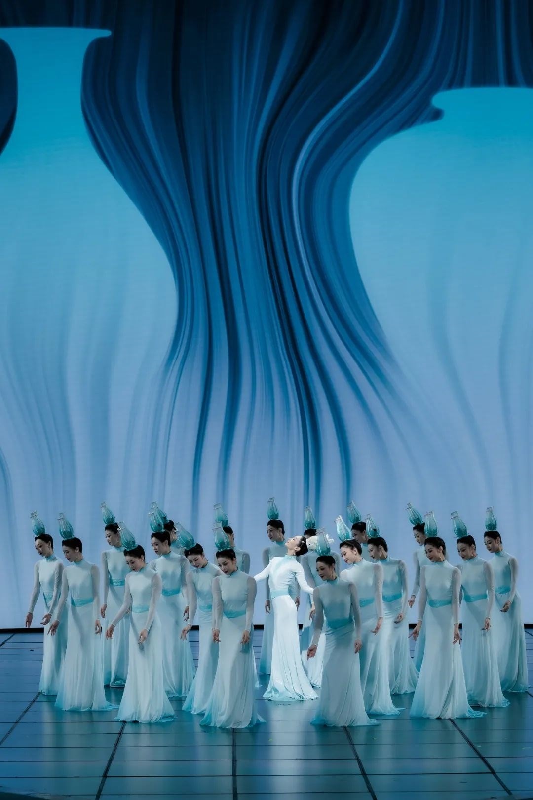 《瓷影》正是以青白瓷為視覺出發(fā)點(diǎn),演出服裝在色彩上著墨,提取“青”“白”這兩種傳統(tǒng)“正色”,展現(xiàn)出大繁若簡的東方美學(xué)。通過舞者的肢體語言展現(xiàn)青白瓷跨越千年的獨(dú)特魅力。