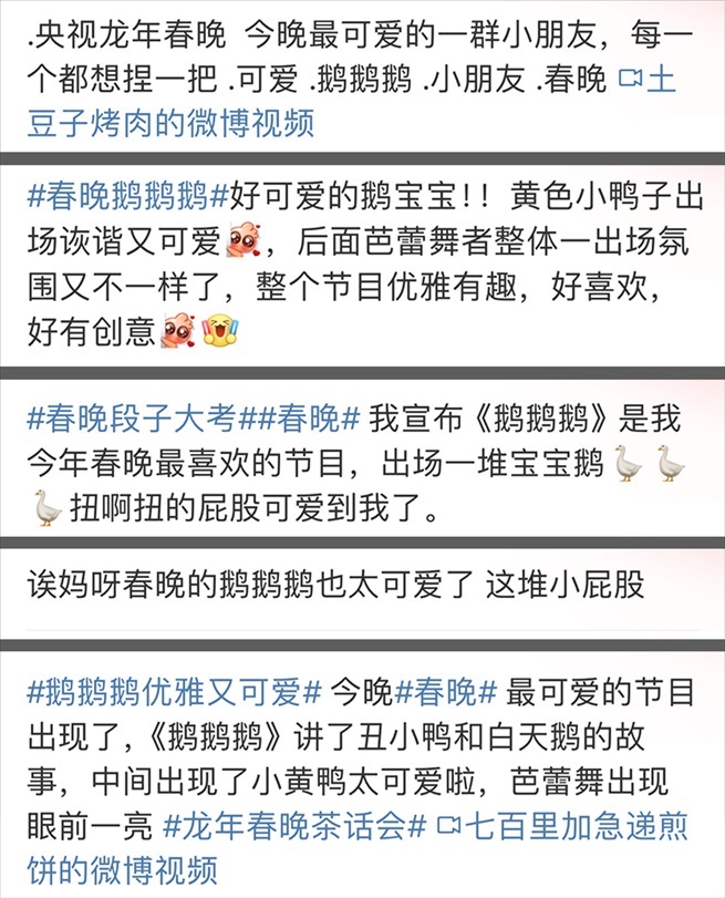 當(dāng)你提“鵝鵝鵝”,自然要期待“曲項(xiàng)向天歌”。駱賓王、唐詩宋詞、中華文化....看到節(jié)目單上的題目《鵝鵝鵝》,大概很多觀眾都以為是要詠詩。當(dāng)大幕開啟,柴可夫斯基的《天鵝湖》奏起,氣氛瞬間變得端莊典雅了,可接下來出場(chǎng)的是一群圓滾滾、扭著屁股的小小鵝,這波反差萌,讓網(wǎng)友直呼“創(chuàng)意絕了”。