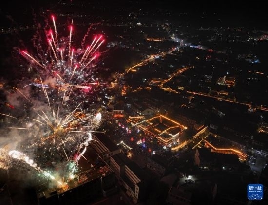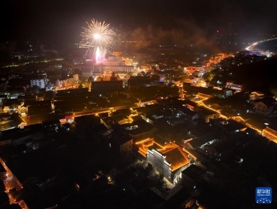 2月23日晚,古鎮(zhèn)舉行放銃花活動(無人機照片)。