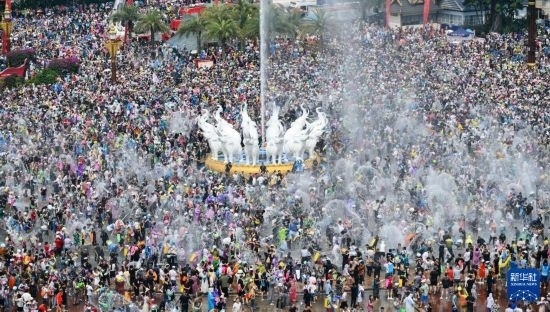 當(dāng)日,云南省西雙版納傣族自治州舉行潑水狂歡活動(dòng),人們歡聚在景洪市潑水廣場(chǎng),用相互潑水的方式互送祝福,慶祝潑水節(jié)。
