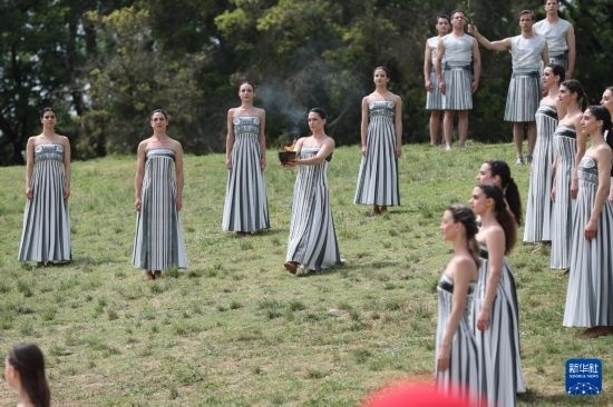 4月16日,扮演最高女祭司的演員瑪麗·米娜取得圣火。當(dāng)日,2024年巴黎奧運(yùn)會圣火火種采集儀式在希臘伯羅奔尼撒半島的古奧林匹亞遺址舉行。新華社記者李京攝