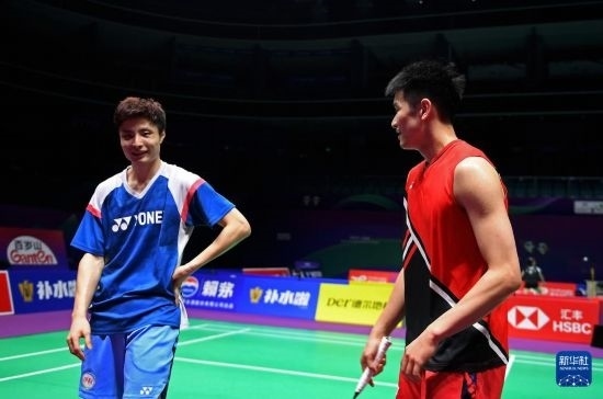 4月26日,石宇奇(左)與李詩灃在訓練中交流。新華社記者 侯昭康 攝