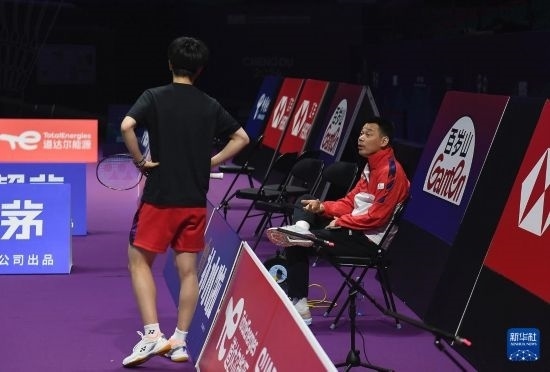 4月26日,中國羽毛球協(xié)會副主席夏煊澤(右)在訓練中指導王祉怡。新華社記者 侯昭康 攝