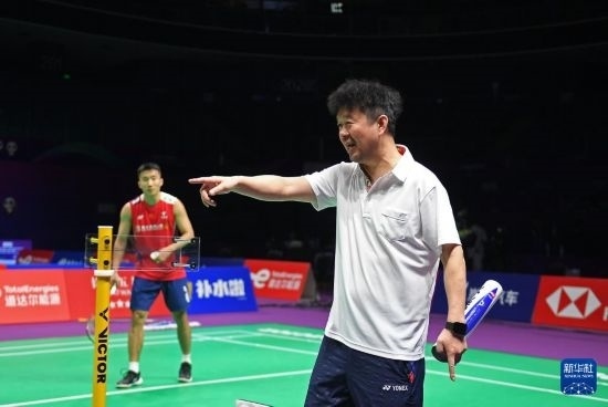 4月26日,男單教練孫?。ㄓ遥┰谟柧氈兄笇騿T。新華社記者 侯昭康 攝