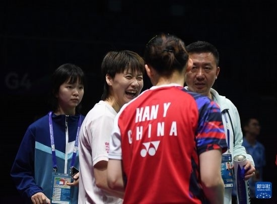 4月26日,陳雨菲(左二)與韓悅(右二)在訓練中交流。新華社記者 侯昭康 攝