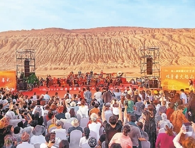 游客在新疆吐魯番火焰山下欣賞交響音樂會(huì)。 劉 健攝(人民圖片)
