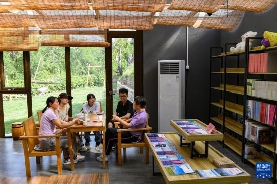 北京石油化工學院的師生在石峽村的一間書屋里就鄉(xiāng)村文旅調研進行討論(5月31日攝)。