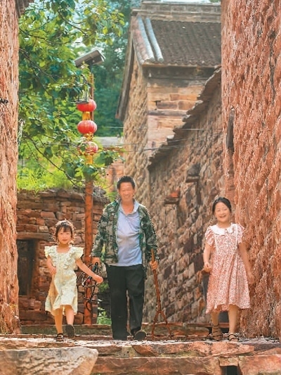 在柴關(guān)鄉(xiāng)石門(mén)溝村,街巷地面全由紅石板鋪成,石板街道隨地勢(shì)起伏,陡坡處壘砌有石板臺(tái)階。圖為村民走過(guò)石門(mén)溝村的古巷。邵玉姿、高儒森攝