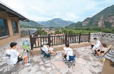 在位于山西省左權(quán)縣澤城村的中國(guó)北方國(guó)際寫生基地澤城驛站內(nèi),山西工學(xué)院的學(xué)生們?cè)诋嫯嫛P氯A社記者 楊晨光攝