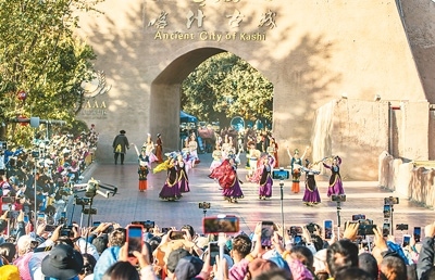 新疆維吾爾自治區(qū)喀什古城景區(qū)舉行形式多樣的文化演出活動(dòng),打造演藝品牌,促進(jìn)文旅融合發(fā)展。圖為游客觀賞古城開城儀式演出。
