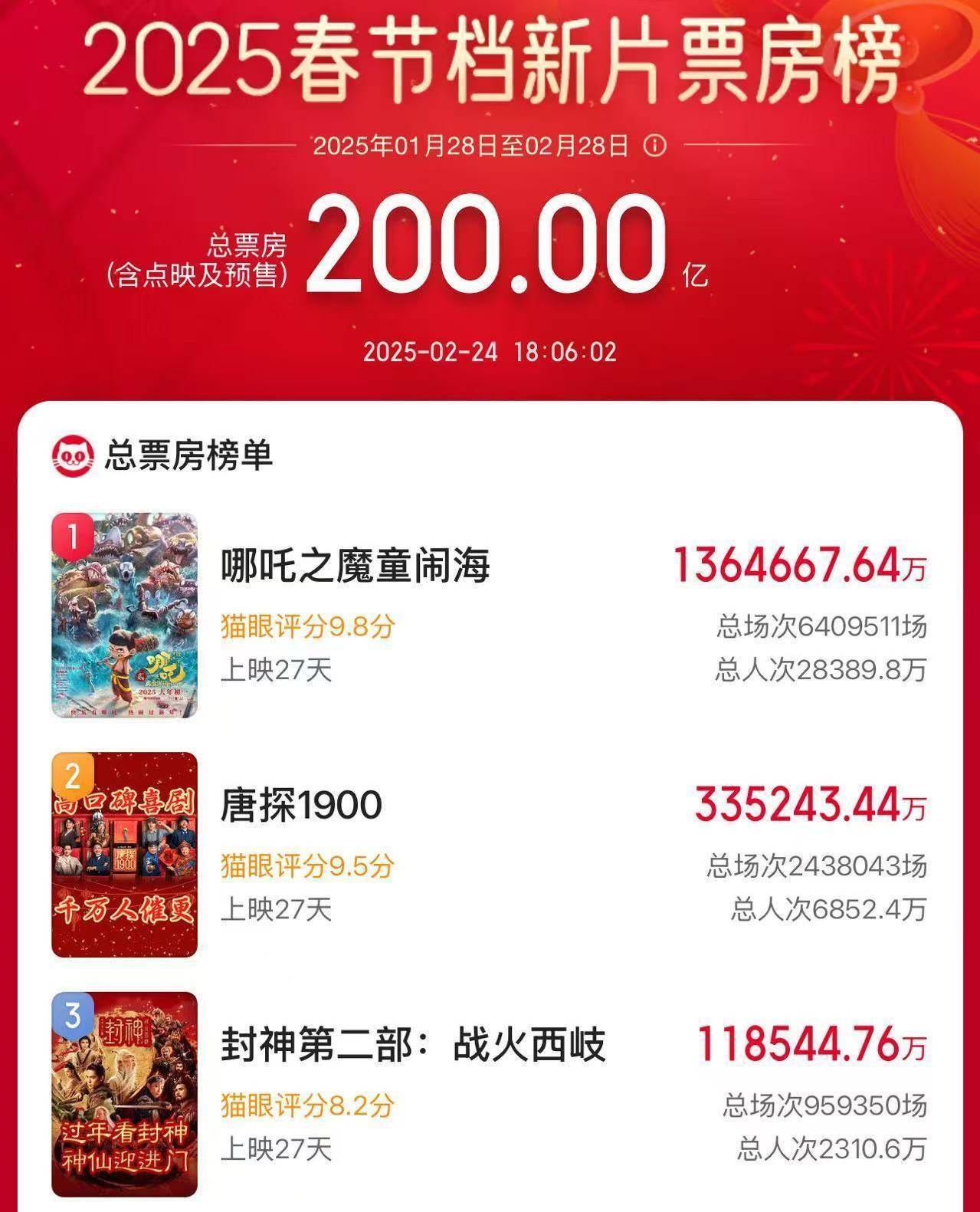 2025春節(jié)檔新片電影總票房破200億