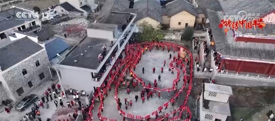 板凳龍是湖北咸寧江源村的特色文化活動,由175節(jié)板凳組成的369米“火龍”在村中巡游,家家戶戶燃放鞭炮接龍祈福。在一波波鼓樂聲中,村民用白酒灑向龍頭、龍尾,道出新年寄語。