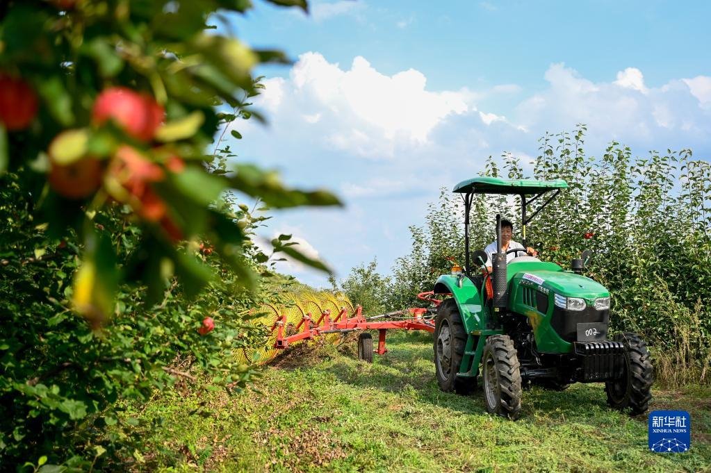 9月4日,在內(nèi)蒙古興安盟突泉縣學(xué)田鄉(xiāng),農(nóng)民將采摘的沙果放入車斗內(nèi)。 -